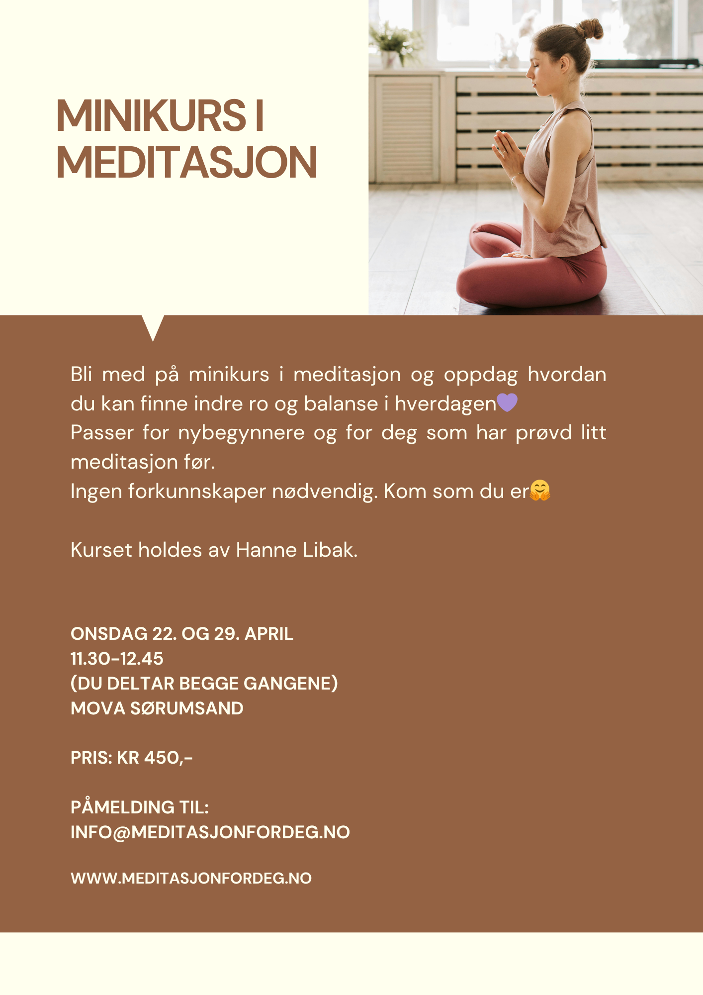 I løpet av kurset får du tilsendt et hefte som viser en enkel beskrivelse av øvelsene, og en meditasjon i form av en lydfil. Sånn at du kan fortsette å praktisere også etter at kurset er over🤗